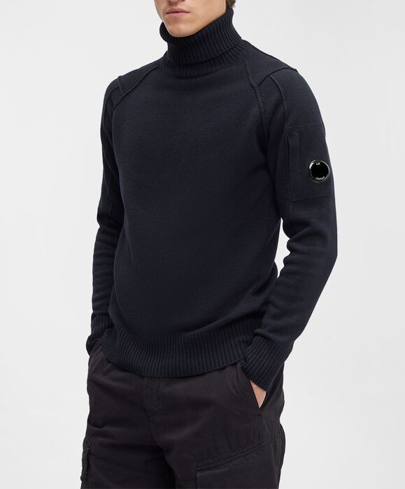 Maglione a collo alto con dettaglio di "nervature" sulle spalle.  Scomparto sulla manica con C.P. Company Lens. È realizzato con lambswool, che rende il maglione morbido, leggero e allo stesso tempo isolante.